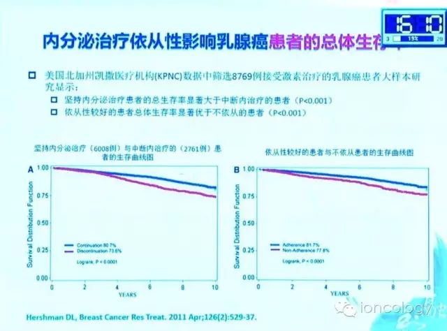 由中国抗癌协会乳腺癌专业委员会主任委员徐兵河教授牵头进行的中国乳腺癌患者SERM类药物治疗状况的研究,针对绝经前受体阳性乳腺癌采用内分泌治疗的依从性进行了相关调查,袁芃教授在此次大会上发布了主要结果。从研究数据中可以看出,患者的依从性随治疗时间的延长逐渐降低,进而直接影响SERM类药物在乳腺癌辅助治疗中的疗效。患者依从性差未持续服药的原因主要有以下几点:药物不良反应、年龄、家人知晓与否以及医生对患者的告知。因此要提高依从性,医生治疗前应给患者足够的指导教育、加强随访,使用更安全有效的治疗药物并加强副反应管理,同时患者应提高自身的心理素质、增强信心。