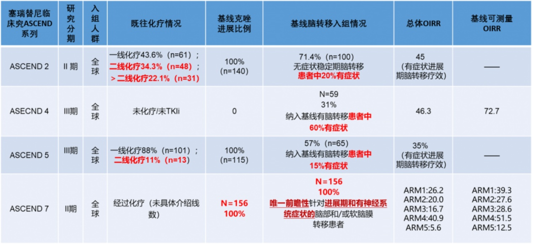 部分ASCEND系列研究纳入了多线治疗的患者,而这部分患者的治疗本身就十分具有挑战;同时,由于有症状、进展期脑转移患者的预后和治疗效果都会更差,而ASCEND-4、ASCEND-5、ASCEND-2等研究都纳入了不同比例的有症状、进展期脑转移患者,使全人群的疗效数据受到很大影响。