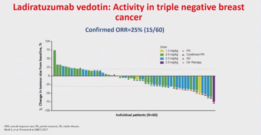 2020年4月,美国FDA批准了首个应用于TNBC的ADC药物Sacituzumab Govitecan(SG),该药物主要靶向TROP2靶点,为TNBC的精准治疗开辟了新的道路。袁芃教授指出,ASCENT研究显示SG在晚期TNBC患者中较医生选择的常规治疗方案显著延长了mPFS(5.6个月vs 1.7个月 p<0.0001)和mOS(12.1个月 vs 6.7个月,P<0.0001),在晚期TNBC总体较差的疗效中,取得了明显的生存优势,SG在晚期TNBC的显效,为早期患者应用提供了很好的思路。
