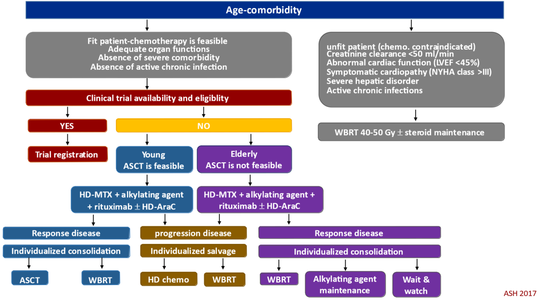 美国血液学会推荐化疗敏感、能耐受化疗(fit)的PCNSL患者若符合纳入标准首选进入临床试验接受治疗,而对于不适合参加临床试验的PCNSL患者,则考虑以大剂量甲氨蝶呤(HD-MTX)为基础的化疗;而对于化疗不敏感、不能耐受化疗(unfit)的PCNSL患者则推荐其接受全脑放疗±激素维持治疗。