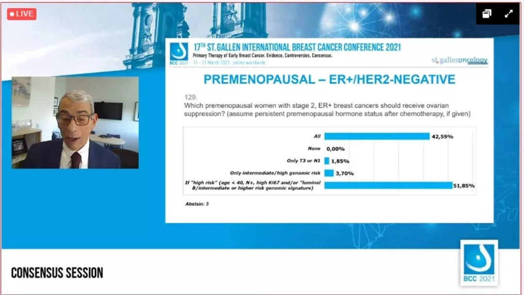编者按:第十七届圣加伦国际乳腺癌大会(SG-BCC 2021)于欧洲中部时间(CET)2021年3月17日~3月21日以线上会议形式召开。《肿瘤瞭望》特邀两位国内肿瘤大咖纵览SG-BCC大会热点,分析HR阳性早期乳腺癌亮点研究,探讨共识专家投票结果。