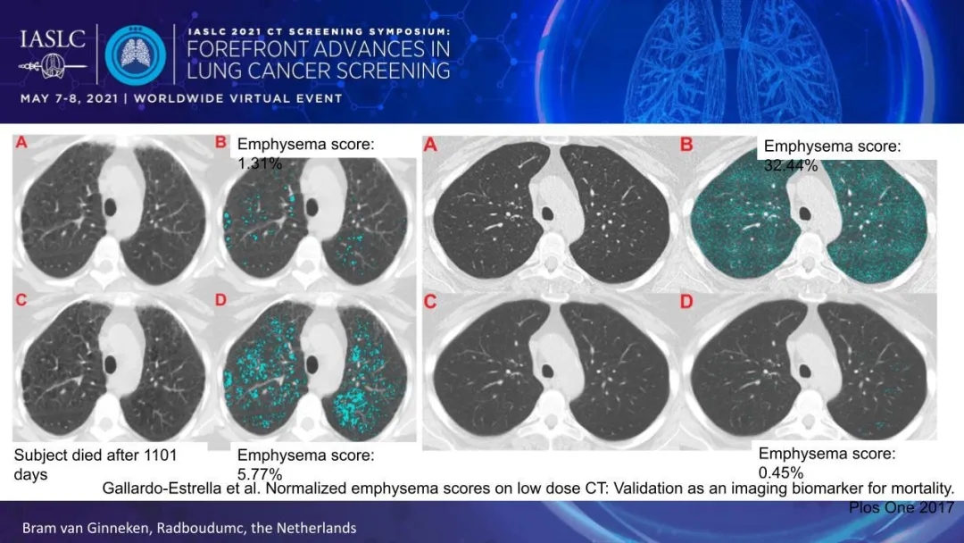 除了发现潜在的恶性肿瘤,CT筛查肺癌还可发现肺部疾病的细微早期迹象。Dr. van Ginneken在报告中回顾说,胸部CT的定量测量可能有助于早期发现不同的阻塞性肺病和间质性肺病,如慢性阻塞性肺病(COPD)和特发性肺纤维化(IPF),同时也提示该患者进行肺癌筛查的最佳频次。此外,许多CT定量测量可以通过人工智能(AI)实现自动化。
