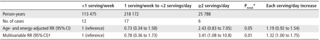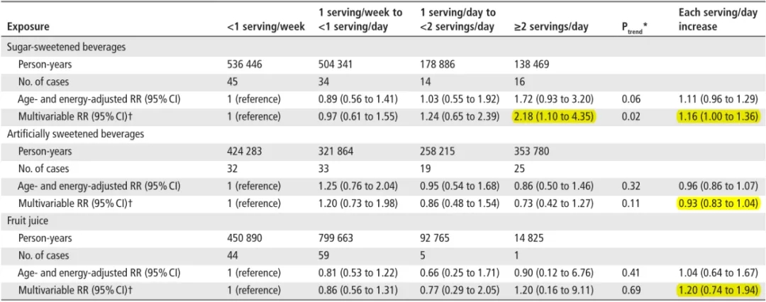 每天摄入≥2份的女性患早发性结直肠癌的风险是每周摄入<1份者的2.2倍(RR 2.18;95%CI:1.10~4.35;趋势性检验P值=0.02),每天每额外摄入一份SSB,患病风险增加16%(RR 1.16;95%CI:1.00~1.36);
