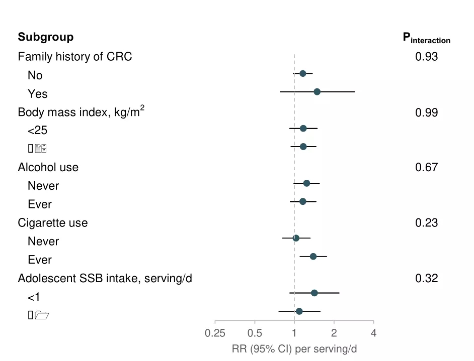 相比之下,在成年期每天增加一份人工增甜饮料或果汁的摄入与早发性结直肠癌风险无关(人工增甜饮料:RR 0.93;95%CI:0.83~1.04;果汁:RR 1.20;95%CI:0.74~1.94)。