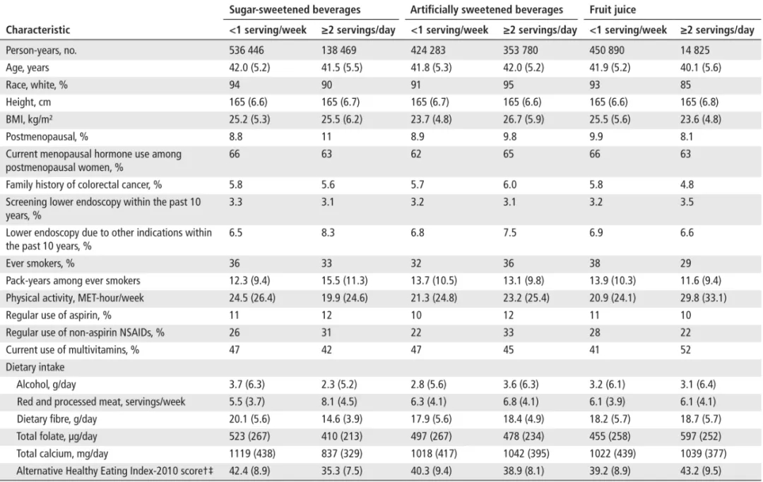 表1. 1991-2015年NHSII中50岁以下女性成年期平均饮料摄入量的年龄标准化参与者特征