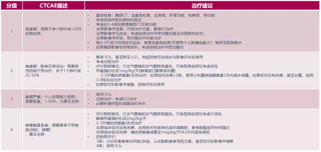 2019 CSCO免疫检查点抑制剂相关的毒性管理指南中肺毒性的分级管理根据CTCAE描述分为4级:1级无症状,2级有症状,3级症状严重,4级呼衰危及生命。