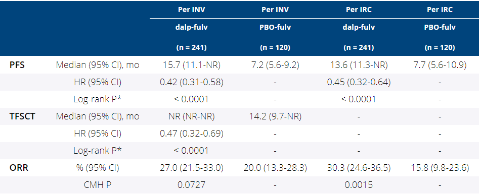 该研究将符合条件的患者以2:1随机分配接受Dalpiciclib联合氟维司群(Dalp-FULV)和安慰剂联合氟维司群(PBO-FULV),主要终点为经研究者评估的PFS。共361名患者随机分为接受Dalp-FULV(n=241)或 PBO-FULV(n=120)。中位随访时间为10.5个月,相对于安慰剂组,Dalp-FULV组显著改善了研究者评估的PFS(mPFS:15.7 vs 7.2 个月;HR,0.42 [95%CI:0.31~0.58];P<0.0001)。经独立评审委员会评估的PFS与研究者评估的结果一致。Dalpiciclib组的第一个后续化疗时间同样改善(TFSCT;HR,0.47 [95%CI:0.32~0.69];P<0.0001)。OS数据尚不成熟,共有25例死亡记录。