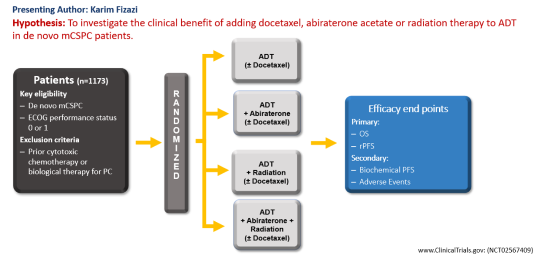 入组患者随机分配至SOC、SOC+阿比特龙、SOC+放疗、SOC+阿比特龙+放疗等4组。由于该研究开展较早(2013年),mCSPC标准治疗也经历了单独ADT到ADT+多西他赛的变迁;这项研究中有60.5%患者的SOC方案为ADT+多西他赛。本次会议主要汇报加入阿比特龙的改善情况。