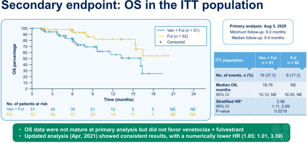 初步分析结果(截至2020.8.5),103名ITT患者中,两组中位年龄分别为58岁和59.5岁,两组CBR相似,VEN+FUL组CBR 11.8%(n=6/51;95%CI:4.44~23.87),FUL组CBR:13.7%(n=7/51;95%CI:5.70~26.26)(95%CI:-16.86~12.94)。BCL2 high/low亚组与ITT人群的CBR和PFS结果相似。观察到的3~4级不良反应发生率两组分别为26%(n=13/50)vs 11.8%(n=6/51)。更新数据截至2020.10.22,OS数据尚未成熟,VEN+FUL组mOS为16.76 个月(HR 2.56,95%CI 1.11~5.89),FUL单药组未达到(HR:2.06[1.04~4.09])。