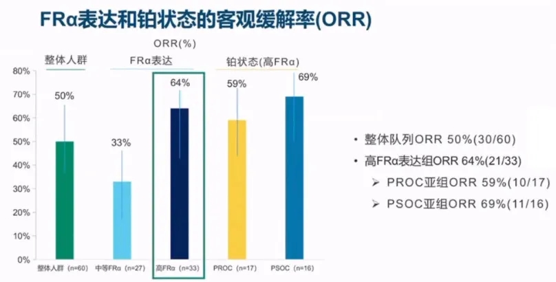 整体队列的ORR为50%,高FRa表达组ORR为64%(21/33),铂耐药卵巢癌(PROC)亚组59%(10/17),铂敏感卵巢癌(PSOC)亚组为69%(11/16)。整体队列的mDOR为9.7个月,高FRa表达组11.8个月,铂耐药卵巢癌亚组9.4个月,铂敏感卵巢癌亚组12.7个月。