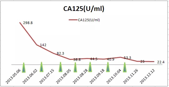 2013.5.15-2013.10.30予紫杉醇+卡铂方案化疗7疗程,化疗期间的CA125最低至38.8u/ml。2013.11.26,CA125水平降到25u/ml(首次达正常值以下)。