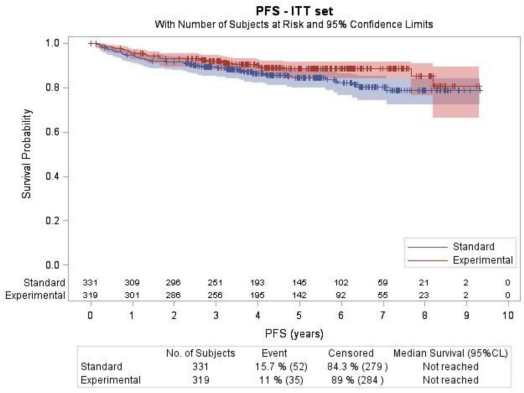 2010年12月至2017年5月期间,在法国和比利时的74个医学中心共招募650例患者,标准组和研究组分别是331例和319例。44%患者>59岁,4%为大包块疾病(>10cm),53%有结外疾病(头颈部51%,消化道17%,睾丸7%,其他25%)。对90.5%病例进行了中心组织学检查。中位随访5.1年(IQR: 3.5-6.5), 87例患者(13.4%)发生PFS事件。标准组的3年PFS为89.2% (95% CI 85.3-92.2),研究组为92.0%(95% CI 88.3-94.5)。研究组与标准组的非劣效性得到证明(风险比0.724,90% CI 0.504-1.040,Com-Nougue检验p值<0.0001)。这项研究同时还检测了研究组的结果是否更优,但未显示研究组结果更优(单侧分层log-rank p=0.0702)。毒性导致的死亡非常罕见,研究组和标准组分别为0和1例。69例患者复发,中位时间25.9个月(4.8-75.7),提示可能发生晚期复发。