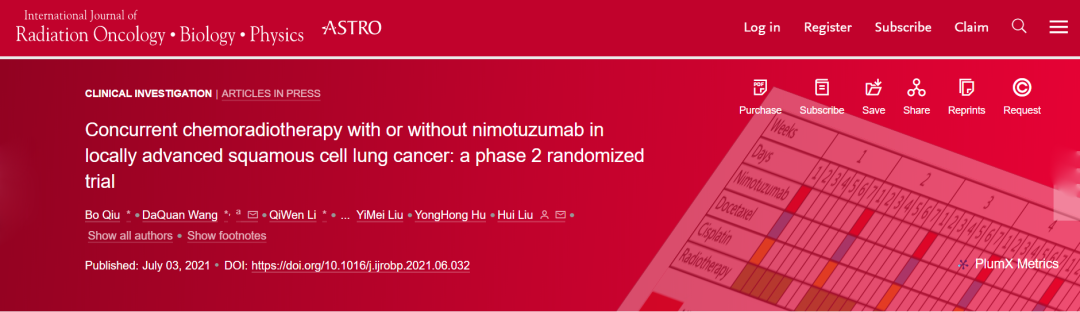 约30%的非小细胞肺癌患者诊断时为局部晚期,这部分患者预后较差,同步放化疗后两年的OS率小于50%,约70%的患者在两年内疾病出现进展,因此探索新的治疗策略,提高这部分患者的预后十分必要。尼妥珠单抗是一款人源化、针对EGFR的单克隆抗体,其对EGFR胞外段的高特异性阻断可抑制EGFR依赖性的细胞信号转导通路激活。一项III期临床研究发现,对于不可切除的头颈部鳞癌患者,尼妥珠单抗联合同步放化疗较单纯同步放化疗可提高PFS及局控率,且并未明显增加不良反应。临床前研究发现,尼妥珠单抗可提高EGFR过表达细胞株接受放疗时的疗效,考虑到鳞癌患者具有较高的EGFR表达水平,因此,这部分患者更有可能从尼妥珠单抗的联合治疗中获益。RTOG-0167研究发现,同步放化疗联合另外一款针对EGFR的单克隆抗体——西妥昔单抗,并未改善患者的PFS和OS,但亚组分析发现,EGFR表达的患者可以从联合西妥昔单抗治疗中获益,两组中位OS分别为42个月和21.2个月。在一项I期、涉及NSCLC的临床研究中,尼妥珠单抗联合放疗具有较好的耐受性。基于上述结果,研究者假设,同步放化疗期间给予尼妥珠单抗治疗可以提高局部晚期鳞状非小细胞肺癌患者的疗效。