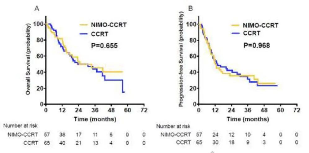疗效:全组中位随访时间为23.3个月,联合治疗组和单纯同步放化疗组分别有43.9%和52.3%的患者出现死亡事件,两组中位OS分别为24.9个月和23.5个月,P=0.655,差异无统计学意义。两年OS率分别52.7%和49.8%,两组中位PFS分别为12.1个月和13.7个月,P=0.968。两组ORR分别为67.7%和70.2%,P=0.652。两组三年局部无进展率分别为57.7%和48.7%,P=0.2,三年无远处转移率分别为54.3%和60.2%,P=0.434。