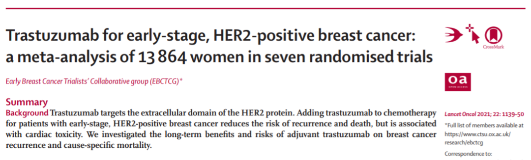 然而,HER2扩增水平、肿瘤特征(尤其是ER状态)或其他患者风险因素对治疗获益的程度和持续时间尚不清楚,且曲妥珠单抗存在一定的心脏毒性(尤其是与蒽环类联合)。日前,《柳叶刀-肿瘤学》发表了一项来自早期乳腺癌试验者协作组(EBCTCG)的荟萃分析,评估了曲妥珠单抗辅助治疗HER2阳性早期乳腺癌的长期获益和风险。
