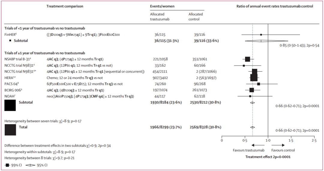 该荟萃分析共纳入了7项RCT(FinHER,NSABP B-31,NCCTG N9831,HERA,PACS 04,BCIRG 006,NOAH),在2000年2月至2005年12月共入组的13864例可手术的淋巴结阳性或阴性乳腺癌患者,收集患者基线特征、首次远处乳腺癌复发和任何既往局部区域复发或第二原发癌的日期和部位、死亡日期和可能原因等进行荟萃分析。主要结局为乳腺癌复发、乳腺癌死亡、无复发死亡、全因死亡。按年龄、淋巴结状态、ER状态、试验首次事件比值比(RRs)进行分层,对标准意向治疗进行对数秩分析。