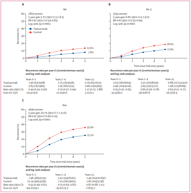 随机化分组后,随着时间延长,曲妥珠单抗+化疗组和单独化疗组的乳腺癌复发率差距逐渐缩小:0-1年时复发风险降低47%(RR 0.53,99%CI:0.46~0.61);2-4年时降低27%(RR 0.73,99%CI:0.62~0.85);5-9年时降低20%(RR 0.80,99%CI:0.64~1.01);≥10年的随访数据较少。