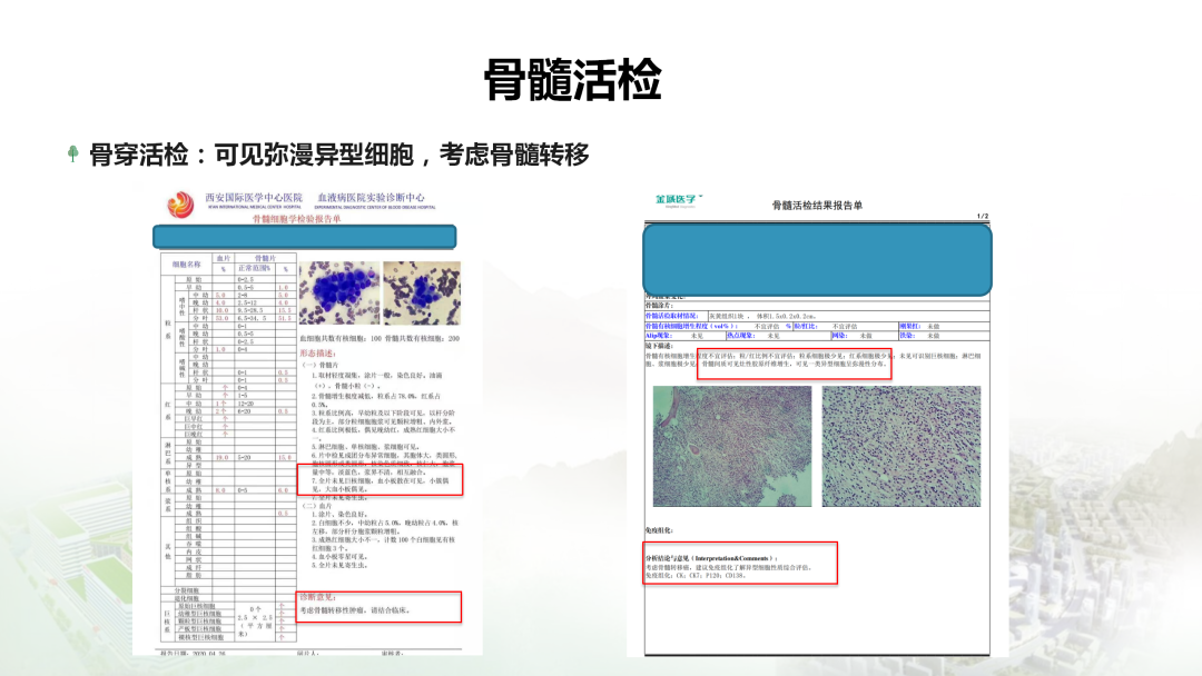 61岁女性,以乏力、纳差为首要表现,血常规提示白细胞、血小板、血红蛋白三系均降低。CT检查提示右乳外上象限肿物,肝、骨转移。超声显示右乳肿物3.8×2.7cm,BI-RADS Ⅴ类, 双侧锁骨上、双侧腋窝多发肿大淋巴结。乳腺MRI显示右乳9点方向肿块,大小3.4×3.1cm, BI-RADS Ⅴ类;双侧腋窝多发肿大淋巴结,最大径2.7cm。右乳肿物及肝占位穿刺活检显示右侧乳腺浸润性癌,肝脏转移癌,免疫组化表现为ER(80%+)、PR(-)、HER2(3+)、Ki-67(25%)。骨髓穿刺活检可见弥漫异型细胞,考虑骨髓转移。