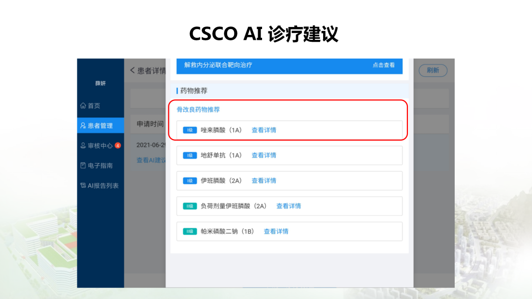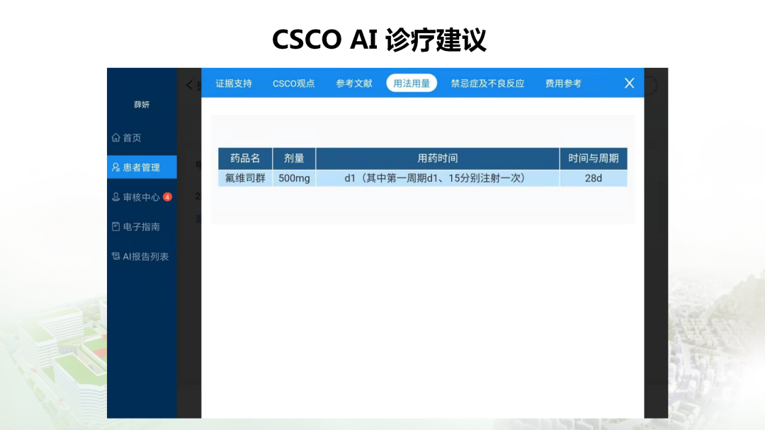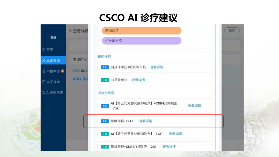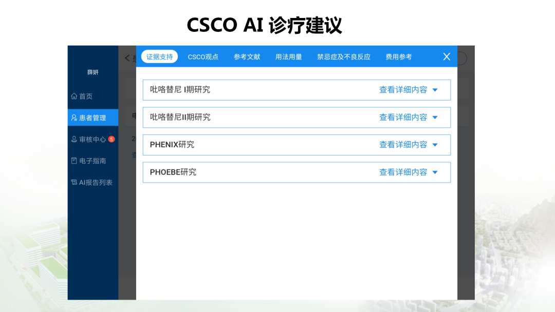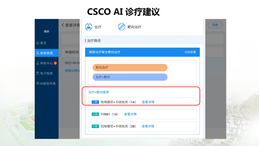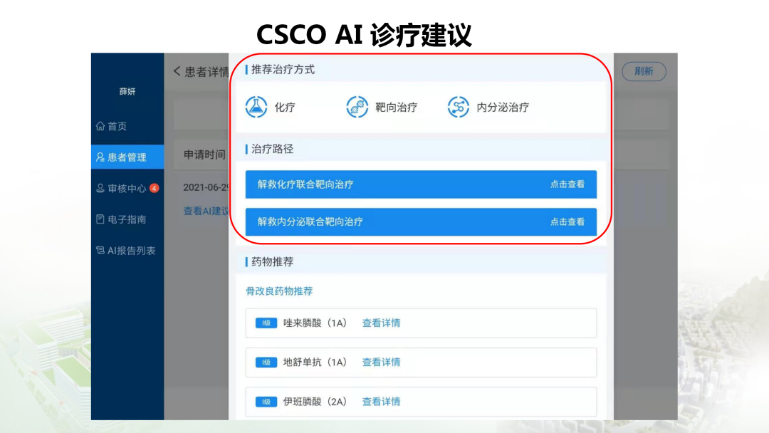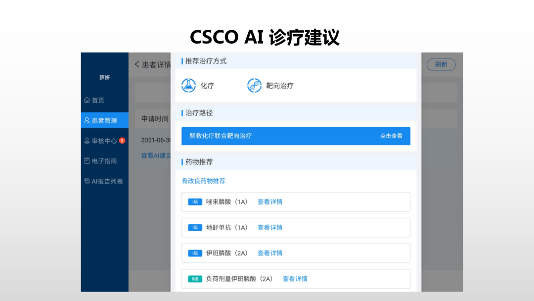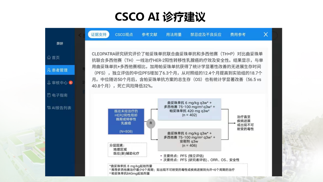 除了管理患者, CSCO AI也为医生再教育提供了快捷便利的途径。年轻医生和基层医生可以在操作CSCO AI的过程中学习到很多文献、专家观点及指南建议。希望CSCO AI能够纳入更多的国际前沿进展,与国内诊疗建议并行推荐,在对比中让基层医生、年轻医生更快成长。
