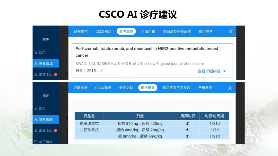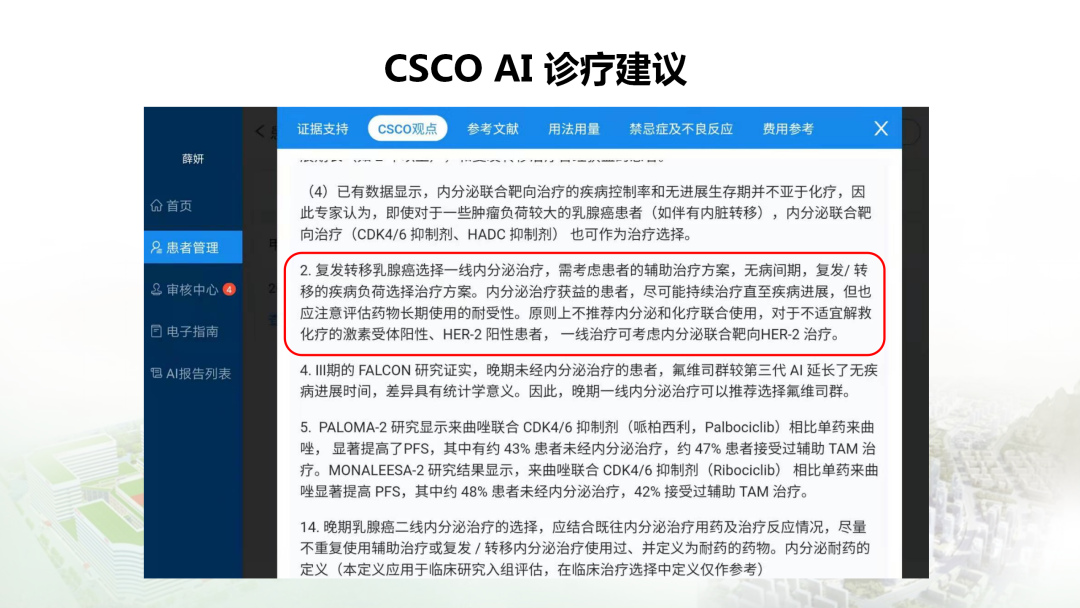 薛妍教授:对于原发曲妥珠单抗耐药的晚期HER2阳性乳腺癌,CSCO AI根据循证医学证据给出了精确指导。后期该领域可以引入更多新的数据,比如HER2CLIMB模式——在曲妥珠单抗治疗进展后保留曲妥珠单抗并加入TKI,该模式已经被NCCN指南纳入,但在中国尚无推荐。因此,我认为CSCO AI可以超前一些,当然江泽飞教授也指出过度超前可能会导致滥用药,因此超前尺度较难把握,需要继续摸索。