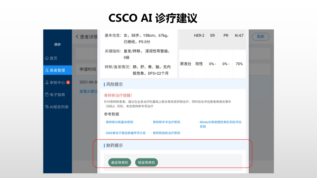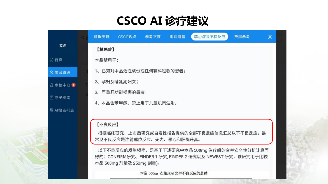 CSCO AI对管理患者提供了极大的帮助。第一,医生书写的病历是否完整、诊疗思路是否正确在这个数据库中一目了然,有利于指导下级医生、管理患者,提高医疗质量。第二,医生可以使用CSCO AI系统提供的乳腺癌治疗科普和不良反应管理视频,提供便利的患者教育。第三,CSCO AI也是个很好的医患沟通平台,让患者的困惑可以及时得到医生的解答,增加医患沟通,助力肿瘤治疗。