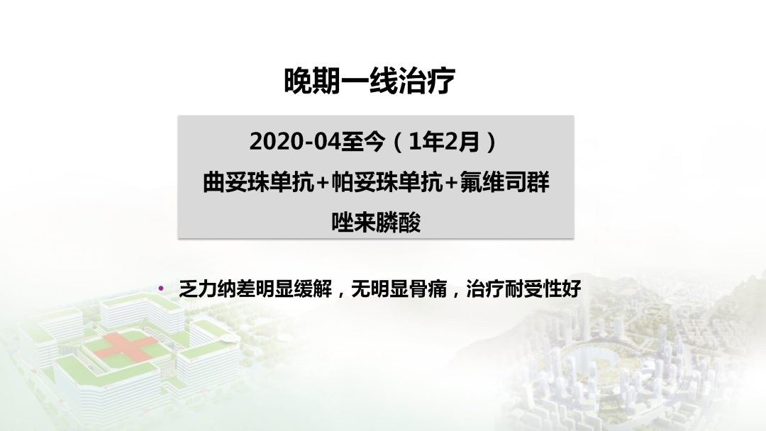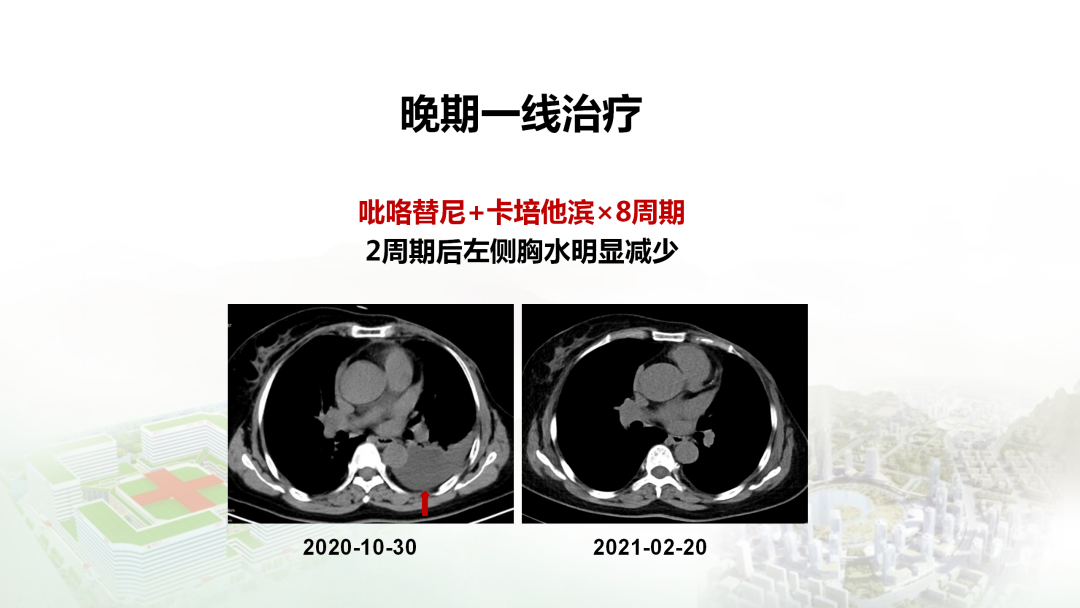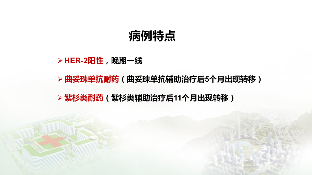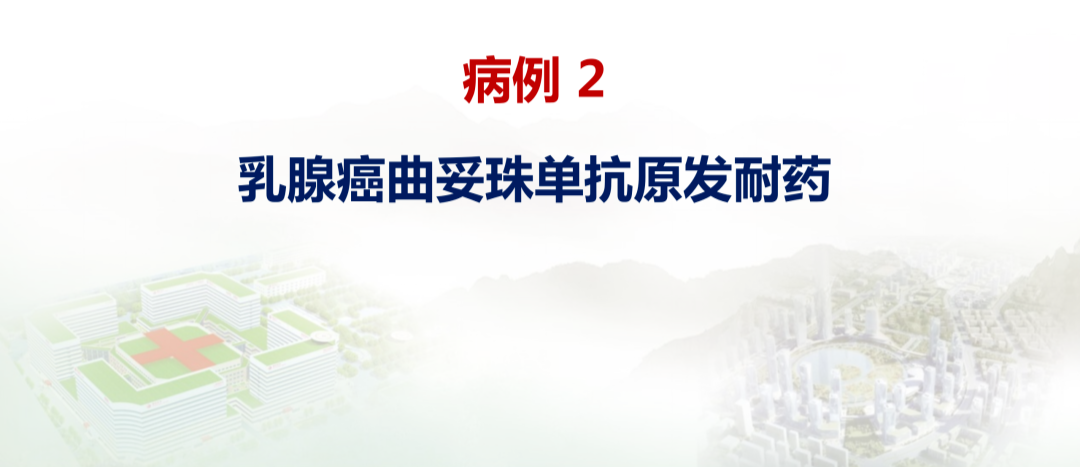 56岁女性,已绝经。2018年12月行左乳癌改良根治术,术后病理提示左乳浸润性癌Ⅲ级,前哨淋巴结(1/1);ER(-)、PR(-)、HER2(3+)、Ki-67(+,40%)。2019年2月至10月使用EC-TH方案,继以放疗,曲妥珠单抗辅助治疗1年,至2020年4月。2020年9月发现肝、胸膜、淋巴结转移,肝转移灶穿刺病理提示浸润性导管癌,来源于乳腺;ER(-)、PR(-)、HER2(3+),Ki-67(+,50%)。PET-CT提示左侧胸壁肌肉后方、左侧胸膜、肝脏、左侧膈肌、左侧腰大肌及多发淋巴结转移,左侧胸腔积液。