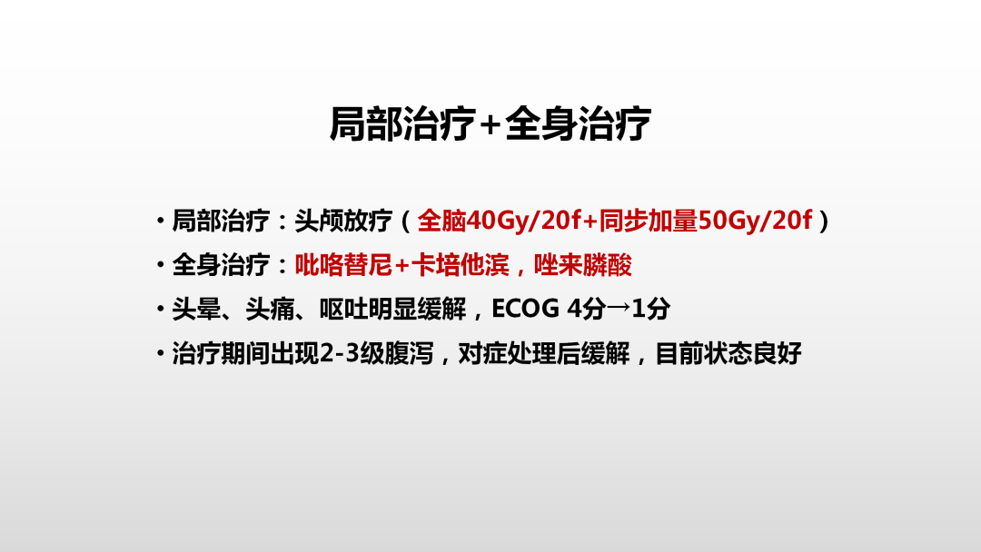 57岁女性,已绝经。2017年发现右乳、右侧腋窝包块,穿刺病理诊断为右乳导管原位癌,可疑浸润;右腋窝淋巴结腺癌浸润。免疫组化ER(-)、PR(-)、Her-2(3+)、Ki-67(70%)。接受曲妥珠单抗+脂质体紫杉醇+洛铂6周期新辅助治疗后行右乳癌改良根治术,术后病理为浸润性癌,脉管癌栓(+),LN(7/17), ER(-)、PR(-)、 Her-2(3+)、Ki-67(20%)。术后行放疗、曲妥珠单抗辅助治疗。22个月后患者出现肺、肝、骨、右侧胸膜多发转移,右侧胸腔积液,胸水查见癌细胞。2019年7月一线选择曲妥珠单抗+帕妥珠单抗+白蛋白紫杉醇治疗8周期,其后使用曲妥珠单抗+帕妥珠单抗+唑来膦酸维持治疗,胸水消失,肝转移灶完全缓解,肺转移灶部分缓解、骨转移灶稳定。2020年7月在双靶治疗期间出现脑转移,一线治疗PFS为12个月。