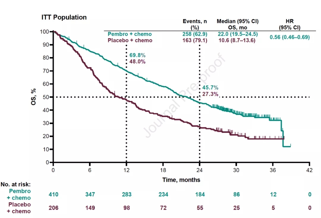 结果显示,研究共纳入616例患者,联合Pembrolizumab组和单纯化疗组分别入组410例和206例患者。数据分析时,联合治疗组和单纯化疗组分别有62.9%和79.1%的患者出现死亡事件。两组中位OS分别为22个月和10.6个月,HR=0.56,24个月OS率分别为45.7%和27.3%。不同亚组的患者均观察到了相应的生存获益。