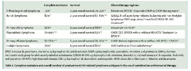 表1、联合ART时代HIV相关淋巴瘤主要亚型的完全缓解率和总生存率