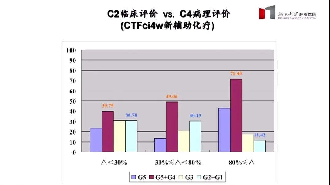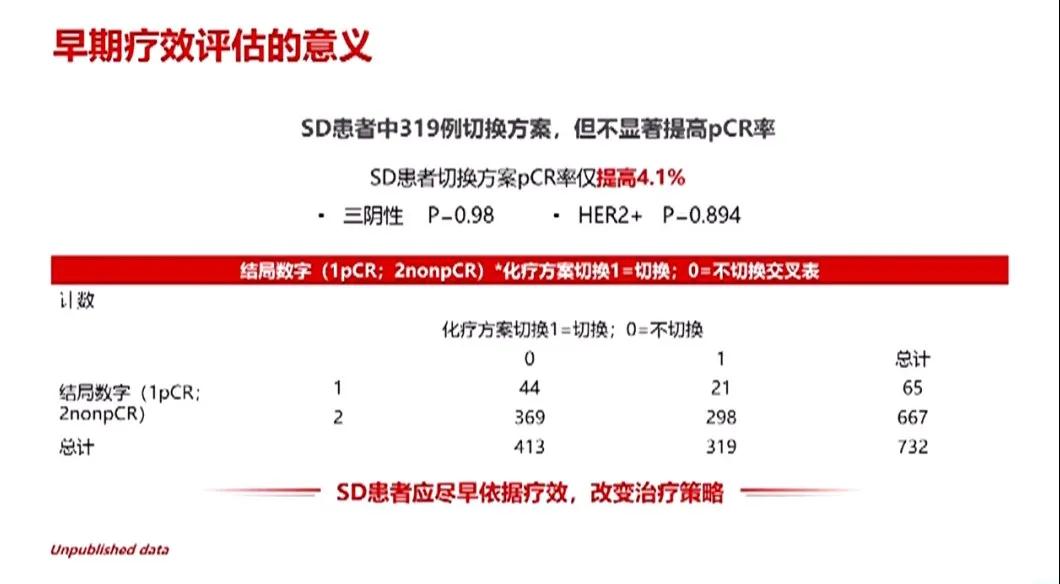 第一,2周期的临床/影像评价是否可靠。我中心既往研究显示,2周期时超声评价SD的患者继续完成新辅助化疗,将有40%的患者可以达到MP 4-5级,疗效尚可,故而2周期时影像检测结果不能有效预测最终结局,此时放弃原有方案是不合理的。