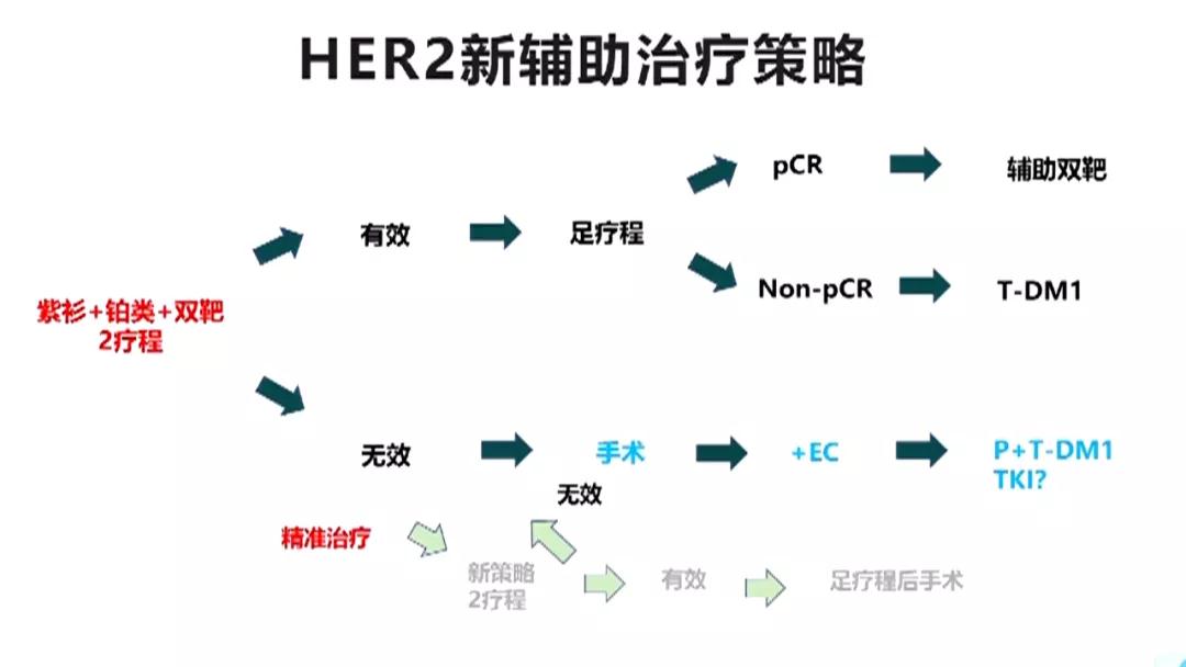 对于HER2阳性乳腺癌,双靶联合双化疗新辅助治疗是pCR率最高的方案,2周期无应答的概率不到10%。此时无应答的话,只能在精准治疗的指导下换用方案,然而实践中评价SD后换用新辅助治疗方案pCR率不足20%,较不转换方案pCR率提高4.1%。