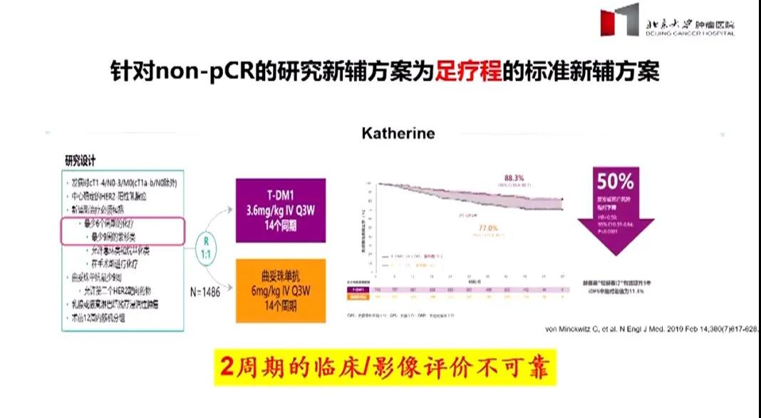 第二,2周期SD/PD后考虑手术,是否实现了新辅助治疗的目的。一方面,若新辅助治疗目的是缩小手术范围,显而易见该目的未达到。另一方面,若新辅助治疗目的是了解药物敏感性,那么KATHERINE研究要求患者至少完成6个周期治疗才能得到有效的评价,否则会使部分患者进行了不必要的强化辅助治疗。
