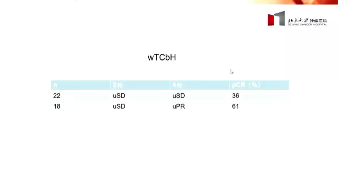 第三,2周期SD/PD后采用新辅助治疗是否安全。Her2阳性乳腺癌的新辅助治疗方案可分为两种情况。如按照标准的AC-TH±P的方案设计,即使AC治疗评价为SD,也应进行TH±P的治疗,一方面有效率较高,一方面可以对AC-TH±P方案的疗效进行整体评价,利于制定辅助治疗方案。如果新辅助采取的是TCbH±P的方案,也可以继续完成该方案治疗。我中心研究显示,若患者2周期后评价SD,到4周期时有近半患者仍然会维持在SD,另一半的患者达到PR,且转为PR组中61%患者为pCR,并不会影响患者手术窗口,故而是安全的。