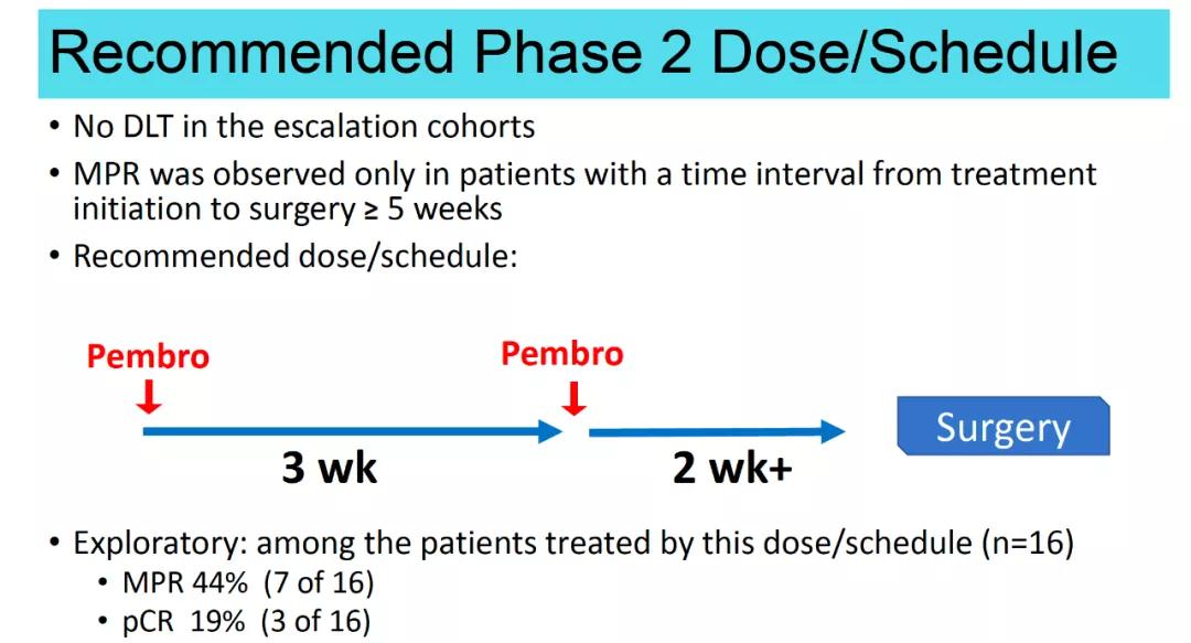 本次WCLC会议中报道的MK3475-223研究是一项由研究者发起的I期、单中心临床研究,探索了免疫单药帕博利珠单抗新辅助治疗早期NSCLC的疗效及安全性。研究纳入第7版TNM分期为I-II期的可手术NSCLC患者,主要研究终点为II期推荐剂量及主要病理学缓解率(MPR)。研究分三组,每组3位患者,第一组为单剂帕博利珠单抗,3周后手术;第二组为间隔3周用两剂帕博利珠单抗,2周后手术;第三组为间隔3周用两剂帕博利珠单抗,1周后手术。研究最终入组26例患者,未观察到剂量限制性毒性和5级治疗相关不良反应。应用II期推荐剂量/方案治疗的16例患者中3例获得病理完全缓解pCR(19%),7例获得MPR(44%)。首剂免疫治疗和手术的间隔时间同疗效相关,所有MPR患者均为首剂免疫治疗和手术间隔5周以上。因此,推荐的II期方案为帕博利珠单抗两剂间隔3周,2周后手术。