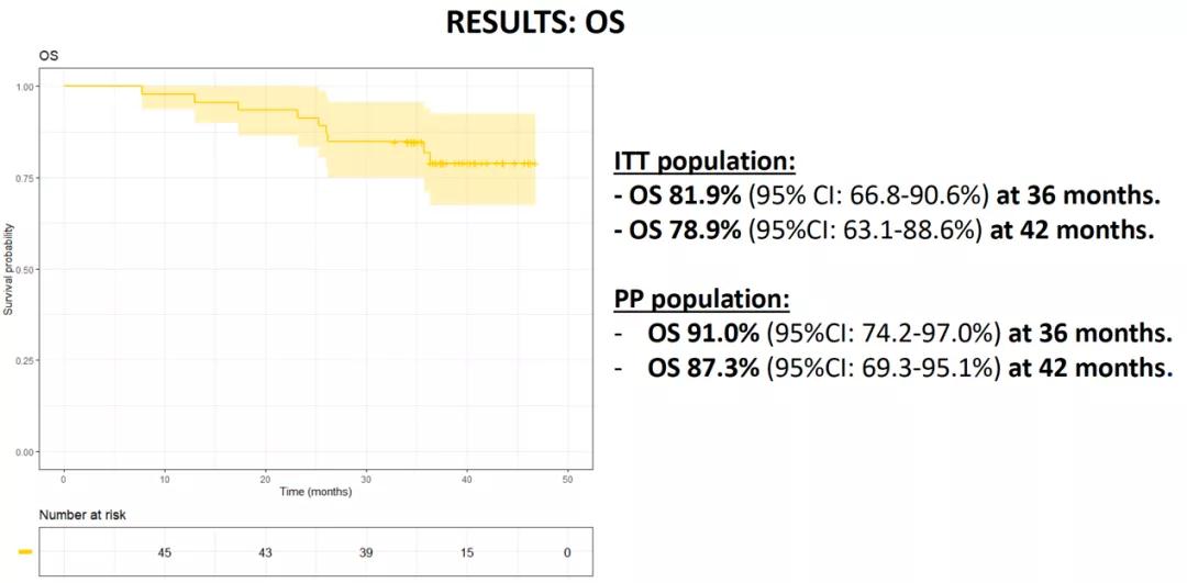 今年的WCLC会议公布了NADIM研究的长期随访结果,该研究是一项开放标签、多中心、单臂、II期临床研究,开创了免疫联合化疗作为新辅助治疗的先河。入组患者接受纳武利尤单抗 (固定剂量360mg)联合紫杉醇(200mg/m2)及卡铂(AUC=5)治疗,每21天为一治疗周期,每周期第一天给药。接受三周期治疗后,手术在最后一个周期治疗结束后42~49天内进行,术后接受纳武利尤单抗维持治疗1年。研究共入组46例患者,中位随访37.9个月,36个月和42个月的PFS率均为69.6%,36个月和42个月的OS率分别为91.0%和87.3%。