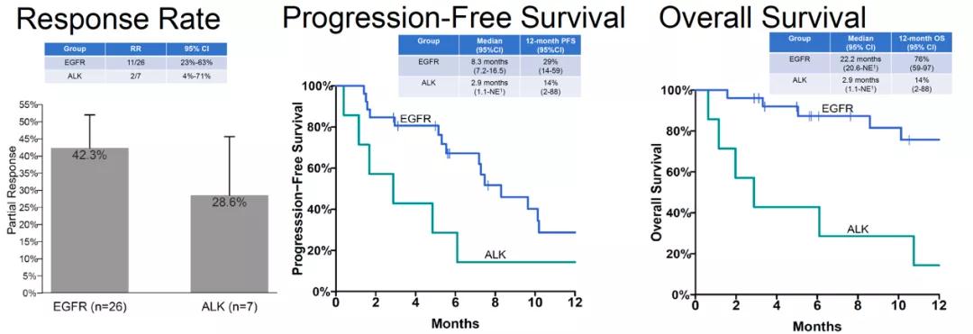 今年WCLC中一项研究分析了帕博利珠单抗联合化疗后线治疗靶向耐药且EGFR/ALK阳性NSCLC患者的疗效及安全性,研究纳入既往经过靶向治疗且耐药的EGFR/ALK阳性晚期NSCLC患者,接受卡铂(AUC=5)+培美曲塞(500mg/m2)联合帕博利珠单抗200mg,每三周治疗一次,4周后接受培美曲塞联合帕博利珠单抗维持治疗,治疗上限为2年。这项单臂临床研究的主要研究终点为反应率(RR),次要研究终点为PFS及OS。研究共纳入33例患者,EGFR和ALK阳性患者分别为26例和7例。研究结果显示帕博利珠单抗联合化疗对EGFR和ALK融合的患者,ORR分别为42%和29%。EGFR突变患者的中位PFS为8.3个月,12月PFS率29%,中位OS位22.2个月,12个月OS率76%。ALK阳性患者的中位PFS为2.9个月,12个月PFS率为14%,中位OS为2.9个月,12个月OS率14%。由此可见,对于EGFR阳性患者,耐药后进行免疫联合化疗能令患者获益,但对ALK阳性患者获益不明显。亚组分析发现,PD-L1≥1%和<1%两组获益未见明显差异,提示PD-L1表达对于这类患者的疗效指导意义不显著。