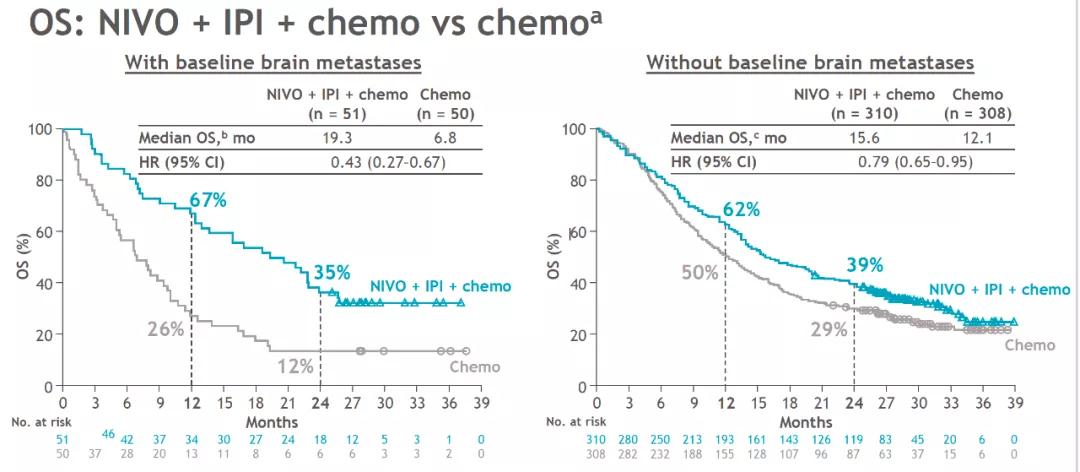 因此,对于基线有脑转移的患者,在化疗的基础上联合纳武单抗及伊匹木单抗组成的四药联合方案,可能会为患者带来更多的获益。