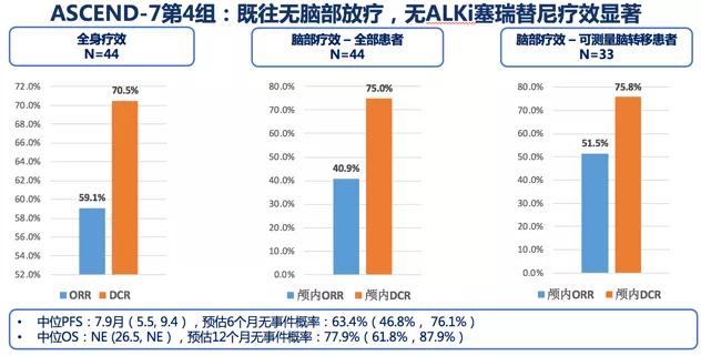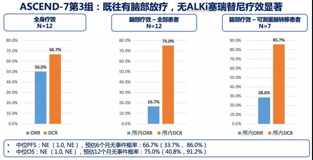 ALK阳性NSCLC患者易发生脑转移,20-30%初治患者存在脑转移,在治疗全程中约50%的患者可出现脑转移。ASCEND-7是塞瑞替尼专门针对脑转移的临床研究,研究设计有三大亮点。一是根据脑部放疗和ALK抑制剂治疗情况进行分组,研究分为5组,既包括接受过脑放疗和ALK抑制剂治疗的患者,也包括了未接受脑放疗和ALK抑制剂治疗的患者;二是单独设立了脑膜转移亚组;三是区别于以往传统临床研究只纳入无症状脑转移患者,ASCEND-7研究纳入的为有症状或进展期脑转移及脑膜转移患者。研究结果显示,塞瑞替尼对脑转移疗效卓越,有效率达30%-60%,即使既往接受或未接受过脑放疗的患者,ORR达到50%和59%。入组20例脑膜转移患者中,ORR难能可贵的达到20%。