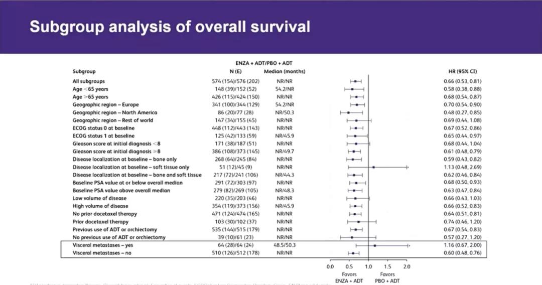 因此,ARCHES研究的亚组分析提示我们,低负荷、高负荷mHSPC均可从恩扎卢胺治疗中获益;而临床中需要将内脏转移患者区分出来,以更好地指导精准治疗。