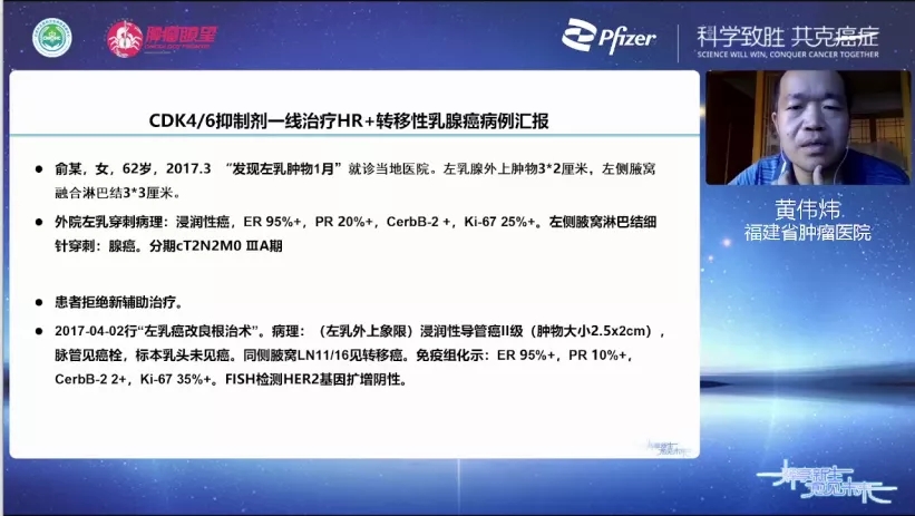 福建省肿瘤医院黄伟炜教授汇报了一例62岁乳腺癌患者,CDK4/6i治疗中假性进展的病例,和张剑教授的观点进行了呼应。
