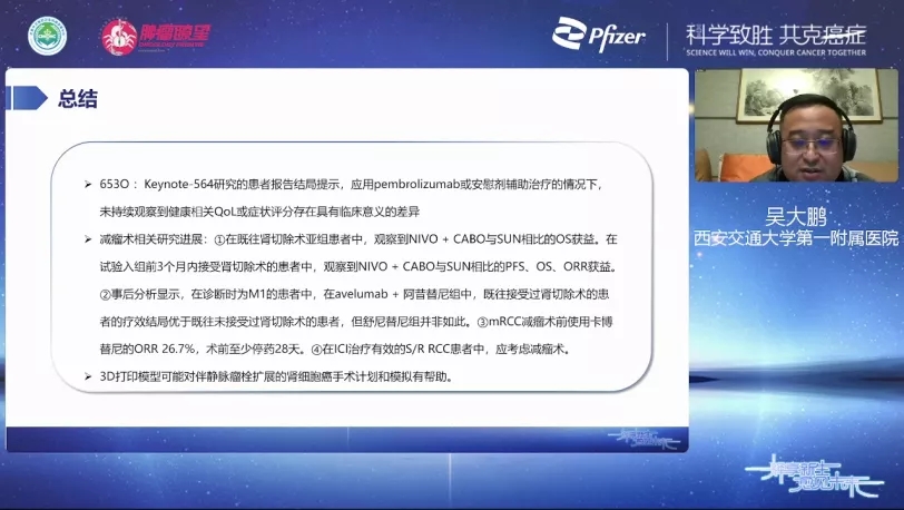 西安交通大学第一附属医院吴大鹏教授做了“2021 ESMO肾癌外科相关研究进展”的精彩报告,分别从局部晚期肾癌辅助治疗、转移性肾癌减瘤术、肾癌手术辅助3D打印模型等方面进行了阐述。Keynote-564是第一个肾癌辅助免疫治疗获得阳性结果的3期研究,本次会议报告患者报告结局与安慰剂不存在具有临床意义的差异,提示在舒尼替尼辅助治疗的选择之外,帕博利珠单抗是肾癌患者辅助治疗的潜在新选择;减瘤术相关研究进展提示,在免疫联合治疗下,减瘤术受到了更多临床医生的关注,在药物治疗有效的患者中,应考虑减瘤术;3D打印模型可能对伴静脉瘤栓的肾细胞癌手术计划和模拟有帮助。