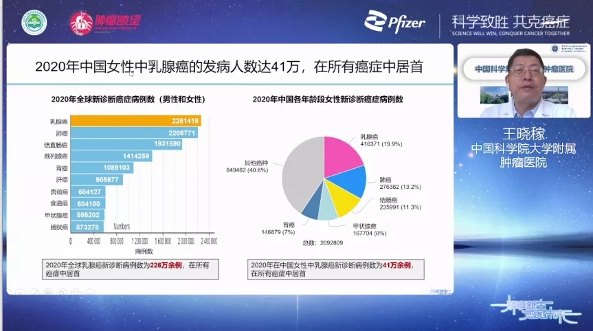 乳腺肿瘤分会场由山东省肿瘤医院王永胜教授和天津医科大学肿瘤医院张瑾教授担任会议主席,在福建省肿瘤医院刘健教授的主持下,中国科学院大学附属肿瘤医院王晓稼教授首先汇报了2020年中国女性乳腺癌的流行病学数据,强调了乳腺癌位居所有癌症发病率第一位,发病人数达41万,而CDK4/6i的出现突破了HR+/HER2-ABC传统治疗的生存瓶颈,引领了HR+/HER2-ABC治疗模式走向“CDK4/6i+”的时代,是中外指南的优选推荐。报告又分析了三大CDK4/6i作用机制及不良反应谱,指出临床工作中应根据患者实际状况进行选择用药。基于真实世界的研究,哌柏西利在美国获得男性乳腺癌的适应症。最后,王晓稼教授对CDK4/6i在不同分子分型乳腺癌中的应用进行了展望,指出免疫治疗联合CDK4/6i、AR阻断剂联合CDK4/6i等策略均具备广阔的应用前景。