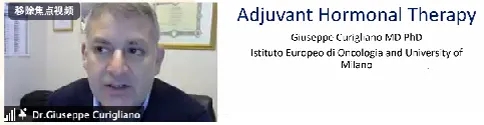 第一位讲者是意大利IRCCS国家肿瘤研究所、米兰大学医学院的肿瘤学教授Dr. Giuseppe Curigliano,他带来的主题演讲《Adjuvant Hormonal Therapy》直击国际科研的最新热点,聚焦绝经后HR+早期乳腺癌的内分泌治疗药物选择和治疗时长,并介绍了2021 ESMO报道的最新数据。
