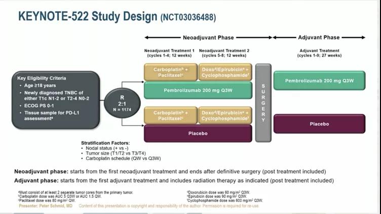 方法:研究入组了未经治疗、无转移,经中心评估确诊的TNBC患者(AJCC分期:T1c N1-2或T2-4 N0-2),按2:1比例进行随机分组。pembro(200mg/Q3W)或安慰剂均联合紫杉醇+卡铂(4周期)+阿霉素或表阿霉素+环磷酰胺(4周期),术后患者接受辅助pembro或安慰剂治疗9周期或至复发或不可耐受的毒性。根据淋巴结状态(+ vs -)、肿瘤大小(T1/T2 vs T3/T4)和卡铂方案(Q3W vs QW)进行分层。主要研究终点是pCR (ypT0/Tis ypN0)和EFS。
