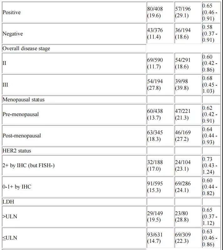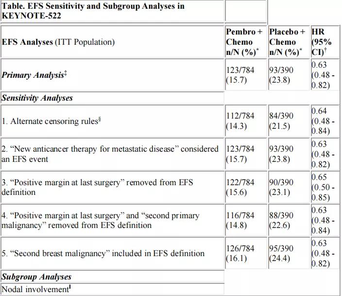 对EFS进行了5项预先指定的敏感性分析,其中2项评估了不同审查规则的影响,3项评估了不同事件定义的影响。对EFS的治疗效果在预先指定的患者亚组中进行了检查,这些亚组由淋巴结转移(阳性或阴性)、疾病分期(Ⅱ或Ⅲ)、绝经状态(绝经前或绝经后)、HER2状态(IHC为2+,但IHC为FISH-或0-1+)和LDH(>ULN或≤ULN)定义。