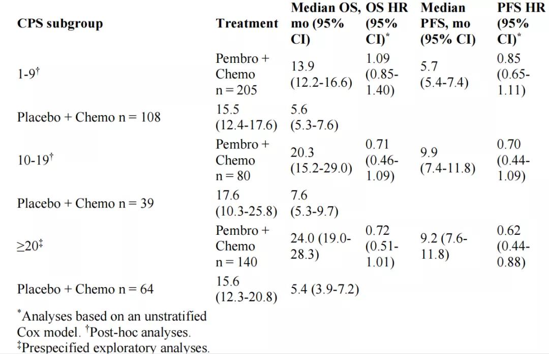 结果:最终数据分析截至时间为2021年6月15日,从随机化到数据截止的中位时间为44个月,CPS 1-9、10-19和≥20个亚组的基线特征一般与ITT人群相似。在初步分析中,OS的HR(95% CI)在CPS≥10亚组为0.73(0.55~0.95),在CPS≥1亚组为0.86(0.72~1.04),在ITT人群为0.89(0.76~1.05);PFS的HRs(95% CI)在CPS≥10亚组、CPS≥1亚组和ITT人群中分别为0.66(0.50~0.88)、0.75(0.62~0.91)和0.82(0.70~0.98)。表1列出了其他CPS亚组的疗效数据。在OS方面,CPS 1-9亚组的结果显示,pembro +化疗和安慰剂+化疗的疗效相当;然而,CPS 10-19和CPS≥20亚组的结果显示,加入pembro后,治疗效果相似。PFS的结果与OS的结果基本一致。