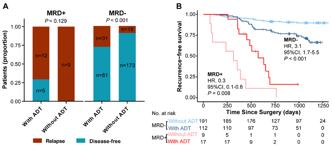 图4. MRD阳性和MRD阴性患者RFS和辅助治疗的相关性
