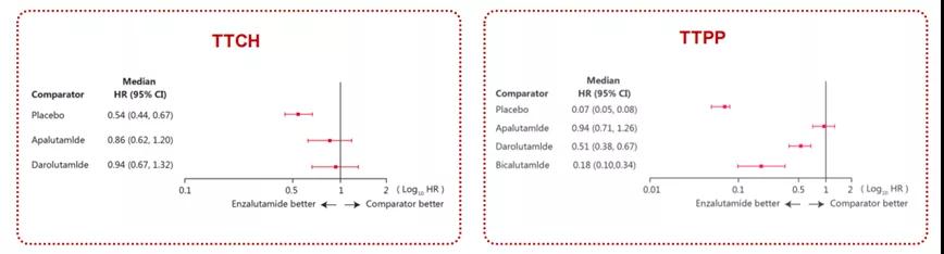目前还没有头对头比较的研究,但已有一些基于临床研究数据的间接比较。2021年ASCO-GU报道的一项网络荟萃分析,比较了PROSPER、SPARTAN、ARAMIS和STRIVE等关键研究的数据显示,恩扎卢胺相较于比卡鲁胺、达罗他胺有显著的MFS和TTPP延长,但三种新型AR抑制剂的OS没有显著差异。