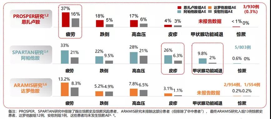 对于不同新型AR抑制剂的不良事件谱,PROSPER研究中恩扎卢胺以疲劳、高血压等常见AE为主,临床管理难度不大;SPARTAN研究中阿帕他胺组有较高频率的皮疹、甲状腺功能减退。阿帕他胺化学结构中的2-氰基吡啶基团可能与血浆蛋白中的谷胱甘肽发生反应形成半抗原,触发免疫反应而导致皮疹。日本的研究提示,阿帕他胺导致的皮疹在日本人群中更多见,所有级别AE和3级AE率分别高达51.5%和14.7%,是引起停药、退出治疗的重要原因;2020年日本曾发布阿帕他胺中毒性表皮坏死松懈风险的警示。
