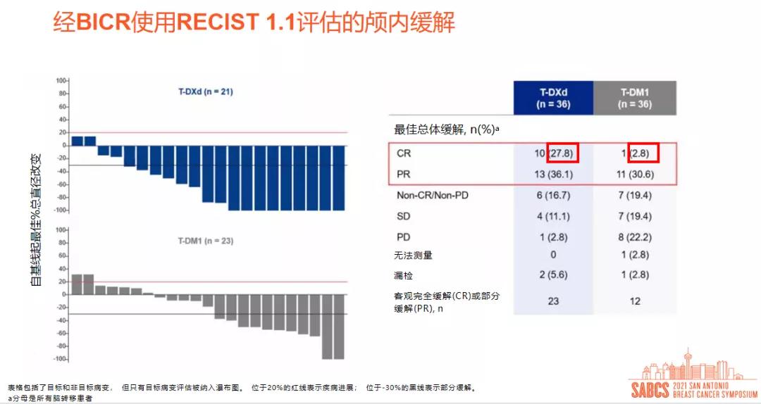 值得注意的是,对于基线存在脑转移患者获益与全体人群一致(ORR:67.4% vs 20.5%)。对颅内病灶进行抗肿瘤疗效评估,T-DXd组颅内CR率达到了27.8%,而T-DM1组仅为2.8%,显示突出的疗效,由此显现出大分子ADC药物在脑转移患者中具有突破性意义的治疗价值,为HER2阳性脑转移的患者带来新的治疗选择。
